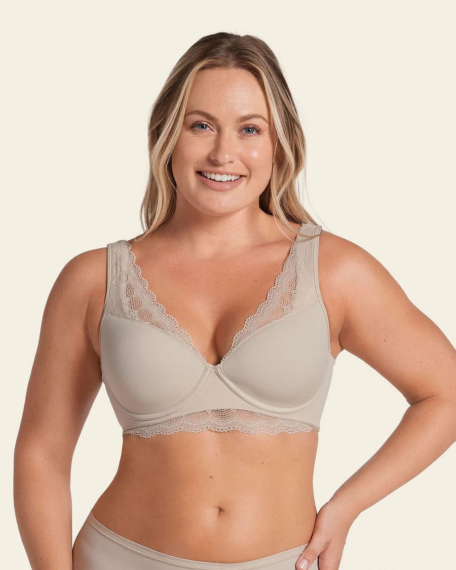Sujetador diseñado para pecho mediano y grande con copas triangulares que cubren completamente el pecho; además, su cubrimiento en sisa y espalda lo hace ideal para aquellas mujeres que buscan disimular y ocultar los mollitas en esta zona. Cuenta con aros para dar un excelente soporte. Sus copas en espuma suave y liviana, sin push up incorporado, se adapta a la forma de tu pecho brindándote una modelación mucho más natural. Color: Piel.